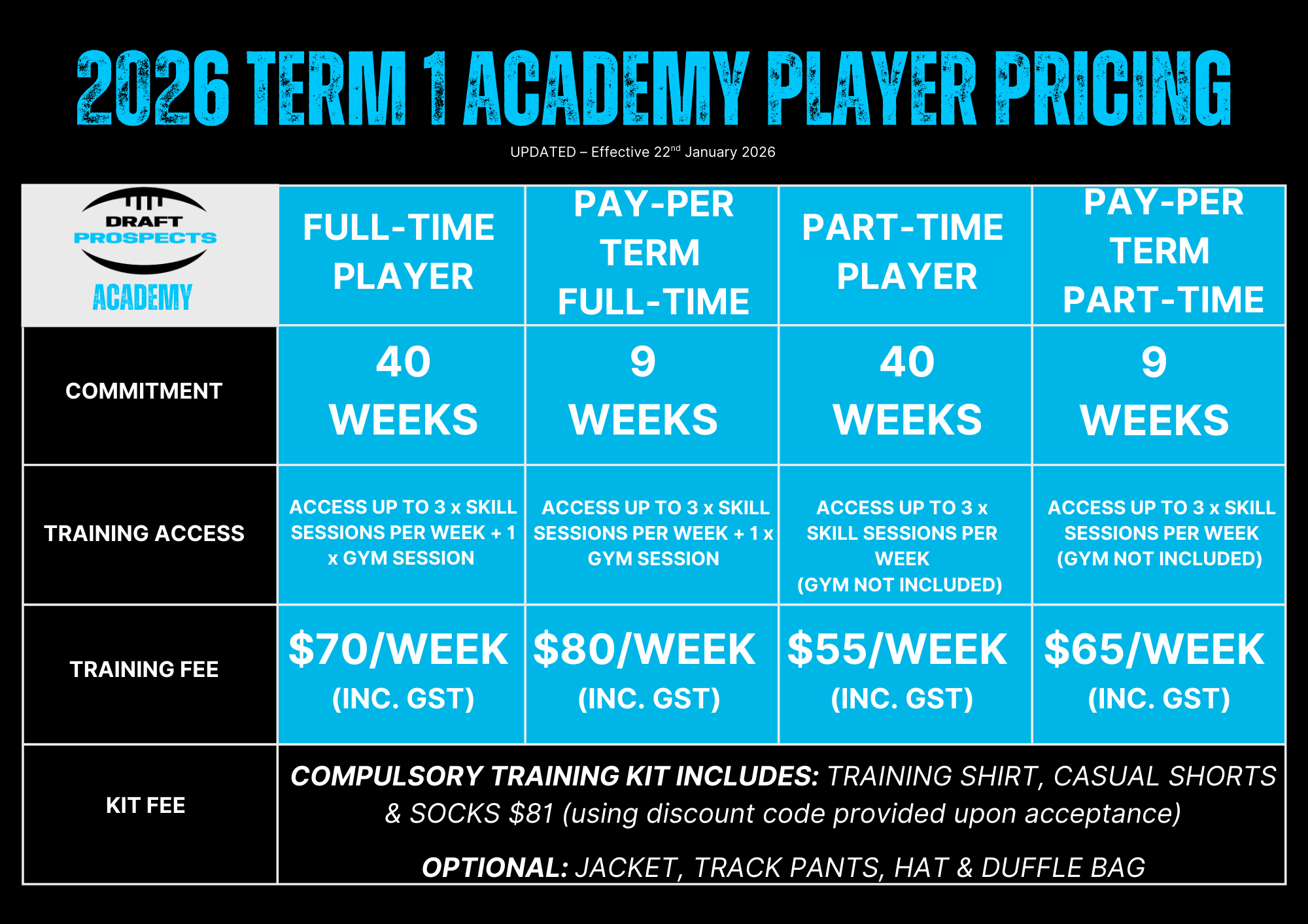 Please note: Payment Terms and ConditionsAll payments made for the academy are non-refundable. This is due to our reliance on external providers who do not accept refunds for their services. For unforeseen circumstances, please contact info@draftprospects.com.auPRICING & PAYMENT INFORMATION